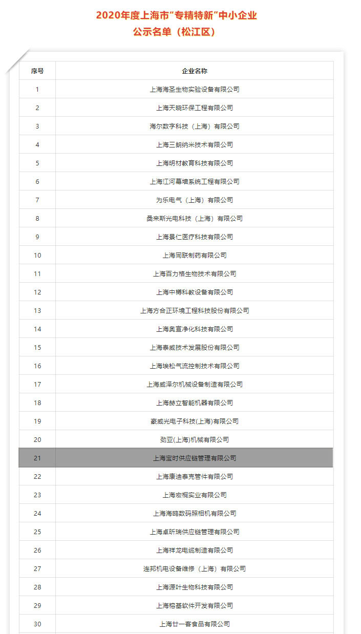 近日,上海寶時供應鏈管理有限公司榮獲上海市“專精特新”中小企業(2020)榮譽。入選榜單需要經過一系...